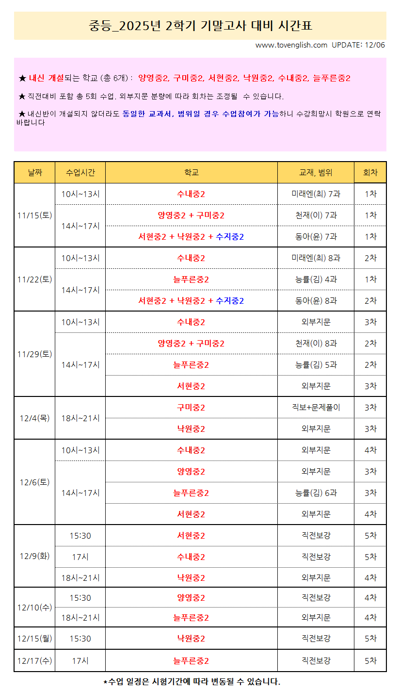 [TOV중등내신시간표] 25년 2학기 기말고사 (11/8)